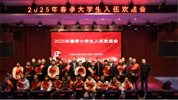 近日,江西冶金职业技术学院在图书馆学术报告大厅举行2025年春季大学生入伍欢送仪式,为21名应征入伍大学生送行。校党委副书记、院长潘山,党委委员、副院长曾晖出席仪式,党委委员、组织部部长曹春宜,学生工作处处长付正根,团委书记、学生工作处副处长涂斌,各分院党支部书记参加仪式。会议由付正根主持。