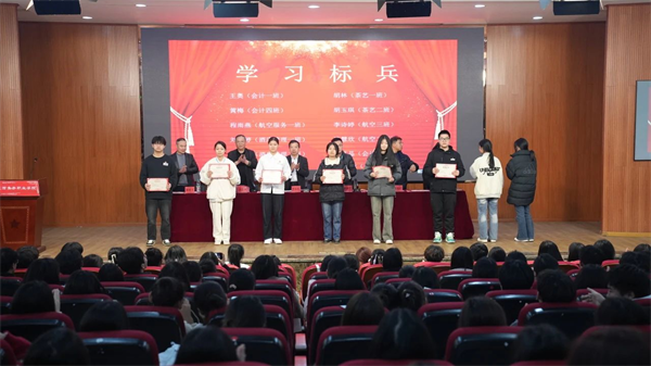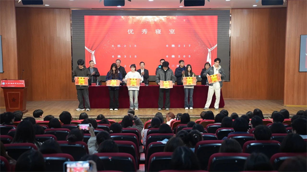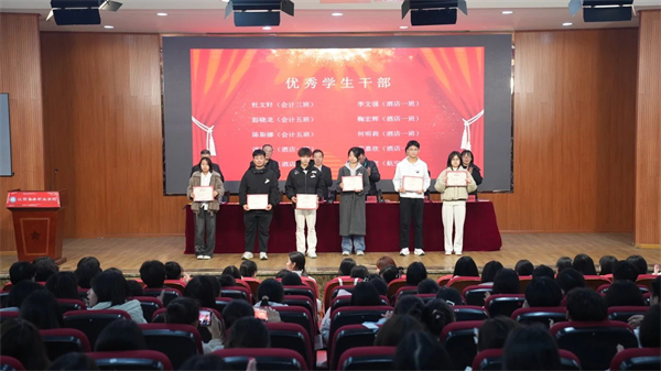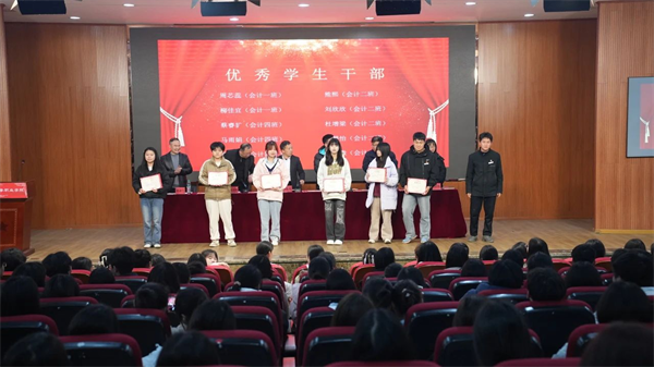 会上表彰了2024-2025学年第一学期表现突出的12名学习标兵、34名优秀学生干部、30名优秀学生会成员,以及15个先进寝室。在热烈的掌声中,校领导及各部门负责人为获奖学生及代表颁发了荣誉证书。