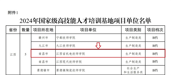 近日,中华人民共和国人力资源和社会保障部办公厅、财政部办公厅公布2024年国家级高技能人才培训基地和技能大师工作室项目单位备案名单,江西机电职业技术学院(江西省机电技师学院)成功获批国家级高技能人才培训基地项目单位,成为全省5家入选单位之一。这是学校在国家级高技能人才培训基地项目上取得的新突破,也标志着学校在服务国家战略、服务区域产业升级方面迈出了坚实步伐。