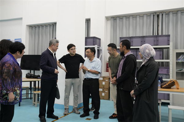 访问团一行深入学校智能控制专精特新实训中心、智能制造生产管理与控制实训室、工业机器人技术应用实训室、集成电路实训室等教学实践场所开展实地调研,对学校创新构建的理实一体化技术技能人才培养模式给予充分肯定与高度评价。在智能制造生产管理与控制实训室内,UTM专家深度体验了数控加工技术应用、机械传动技术及机器人系统综合应用场景。在集成电路实训区,双方就芯片设计等高端技术应用领域的相关课程建设进行了深入讨论。