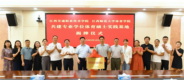 9月10日,江西交通职业技术学院举行与江西师范大学体育学院共建专业学位体育硕士实践基地揭牌仪式。学院党委副书记、院长黄明忠和江西师范大学体育学院院长贺新奇共同为“江西师范大学体育学院专业学位体育硕士实践基地”揭牌。学院党委副书记熊耀龙主持仪式,党委委员、副院长江志强,江西师范大学体育学院副院长游茂林,研究生部副主任顾学艳出席仪式。学院相关职能部门负责人及体育教研室教师参加。