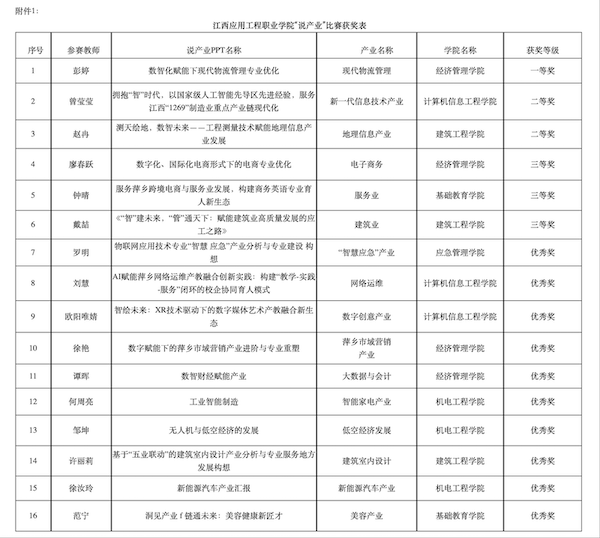 为全面贯彻新发展理念,深化产教融合,提升专业团队的综合素质与育人水平,江西应用工程职业学院于2025年11月11日举办“说产业”比赛。此次比赛旨在引导教师深度对接区域产业发展,践行教书育人使命。