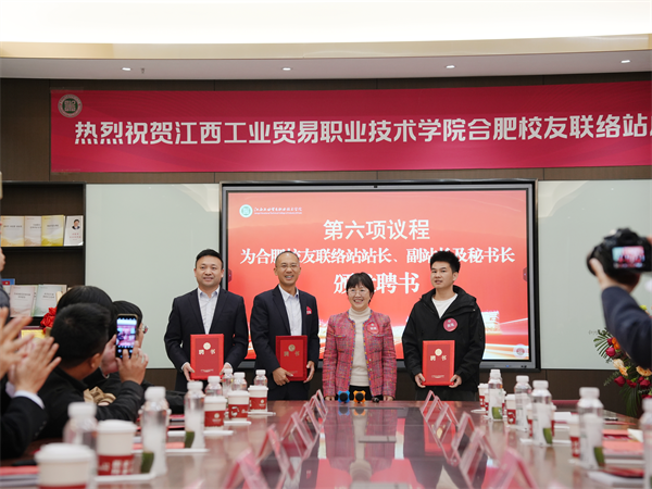 大会在庄严的国歌声中拉开帷幕。会上,与会人员共同观看学院2025年重要新闻视频,学院粮油食品系副主任刘玉珍宣读《关于成立江西工贸学院合肥校友联络站的决定》,大会审议通过《江西工贸学院合肥校友联络站章程》。胡晖与刘忠建共同为合肥校友联络站揭牌,胡晖还为联络站首任站长刘忠建,副站长陈斌、高强、周海兵(兼任秘书长)颁发聘书。