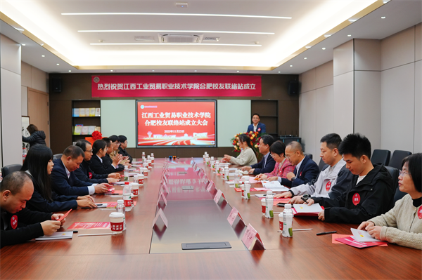 钟毓赣水畔,融汇皖江潮。为进一步加强校友与母校、校友间的联系交流,展示办学成果与校友事业成就,2025年11月23日,江西工业贸易职业技术学院合肥校友联络站成立大会在安徽省合肥市举行。受学院党委书记万晓波委托,学院党委委员、副院长胡晖出席大会,上海校友联络站站长谌祖桂、南昌校友联络站副站长白小军、安徽邻几便利店有限公司创始人刘忠建及在皖工作校友代表、粮油建艺系教师代表参加大会,共同见证成立时刻。学院粮油建艺系负责人冯训阳主持大会。