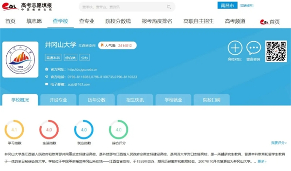 百度搜索“井冈山大学”进入高考数据库,数据库中包含学校历年分数、招生专业、宣传片等招生信息,点击“留言咨询”即可进入招生咨询智能问答系统进行提问或给招办老师留言。